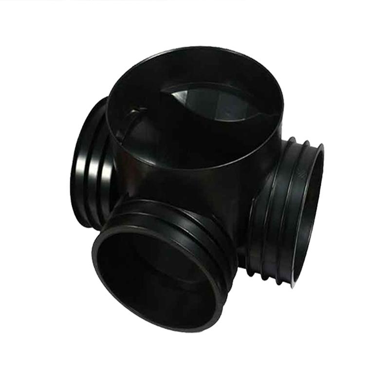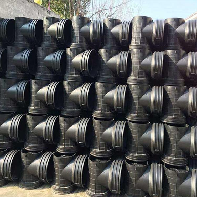 塑料檢查井的井座部分大多采用的是一次性注塑成型,以異徑接頭、變角接頭和橡膠密封圈等配件來達(dá)到改變管徑及角度的連接。塑料檢查井配套開發(fā)了井蓋、井筒和相關(guān)配件,路面載荷通過井蓋、井座作用于檢查井周圍,避免了路面載荷對(duì)檢查井的破壞。
