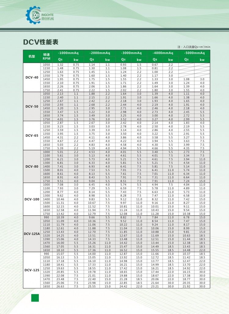 1.風機真空度范圍大:DCV型真空風機壓力可達-5000mmaq(-0.5Kg/cm2)。