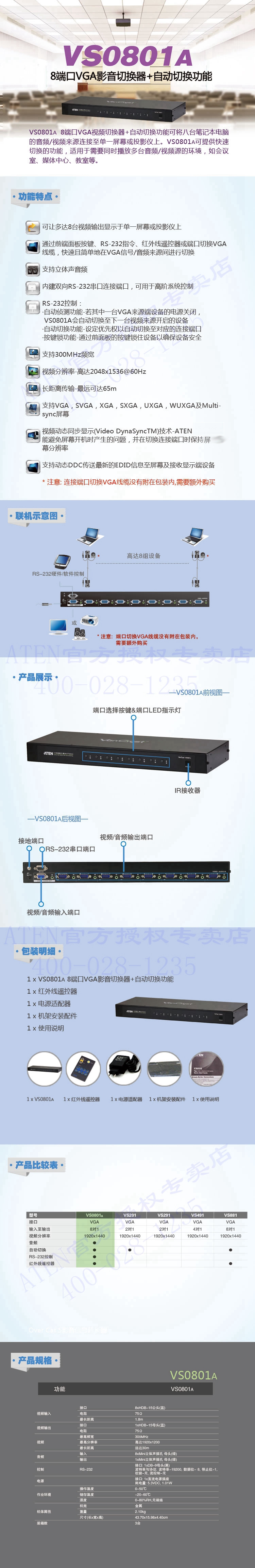 VS0801A 8端口VGA視頻切換器+自動切換功能可將八臺筆記本電腦的音頻/視頻來源連接至單一屏幕或投影儀上。VS0801A可提供快速切換的功能,適用于需要同時播放多臺音頻/視頻源的環(huán)境,如會議室、媒體中心、教室等。