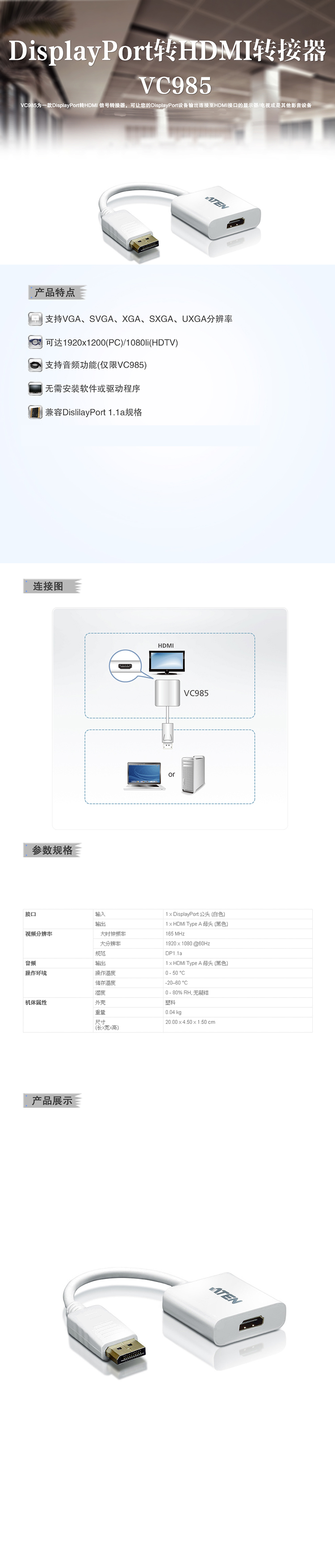 VC985是一款高性價比、高性能的信號 轉(zhuǎn)換解決方案。這些轉(zhuǎn)接器支持具備DisplayPort輸出的臺式電腦或是筆記本電腦, 可支持分辨率高可達(dá) WUXGA(1920x1200@60Hz)。