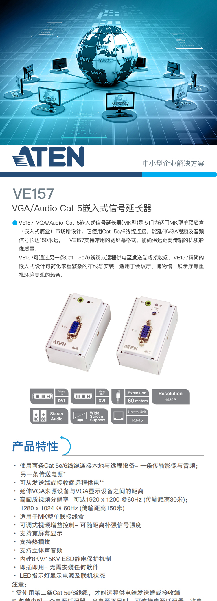 VE157可通過(guò)另一條Cat 5e/6線纜從遠(yuǎn)程供電至發(fā)送端或接收端。VE157精簡(jiǎn)的嵌入式設(shè)計(jì)可簡(jiǎn)化笨重繁雜的布線與安裝,適用于會(huì)議廳、博物館、展示廳等重視環(huán)境美觀的場(chǎng)合。