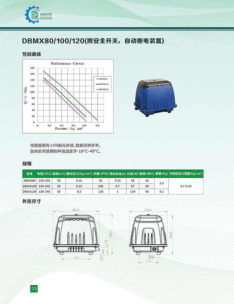 DBMX120電磁式鼓風(fēng)機(jī)內(nèi)部采用更先進(jìn)的設(shè)計(jì)理念與元素,相較以往之同規(guī)格產(chǎn)品流量大予可使用壓力(水深)提升,而且功耗更低 ,且產(chǎn)品更配有雙重保護(hù)裝置,一方面為溫度過(guò)載保護(hù),以保護(hù)與降低產(chǎn)品因短時(shí)間不當(dāng)使用條件而可能造成的產(chǎn)品毀損,另一方面為產(chǎn)品內(nèi)部防護(hù),當(dāng)鼓風(fēng)膜于不可預(yù)知的情況破裂時(shí),可實(shí)時(shí)的停止產(chǎn)品的持續(xù)運(yùn)作,以降低維修與零件更換的成本。