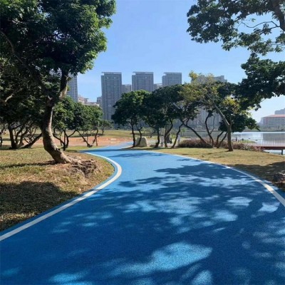 作為一種新的環(huán)保型、生態(tài)型的道路材料,該種透水路面面板鋪裝厚度根據(jù)巖性以及采用單粒徑巖石粒徑?jīng)Q定,一般厚度范圍在4~7cm。基層結(jié)構(gòu)可以采用半剛性基層或者是級配碎石、級配礫石透水基層,具有良好的透水性,是由聚氨酯膠粘劑與單級配或間斷級配骨料按一定配合比拌合而成的新型路面材料。目前該種材料主要用于鋪裝景觀道路等輕交通路面。