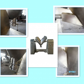 1、V型混合機(jī)的混合料筒為兩個(gè)不對(duì)稱的圓筒,材料為優(yōu)質(zhì)不銹鋼板卷圓密焊成型,筒體的兩端采用橢圓形封頭,在兩只封頭上均裝置進(jìn)料口,更利于物料混合完畢后對(duì)筒體的清洗。