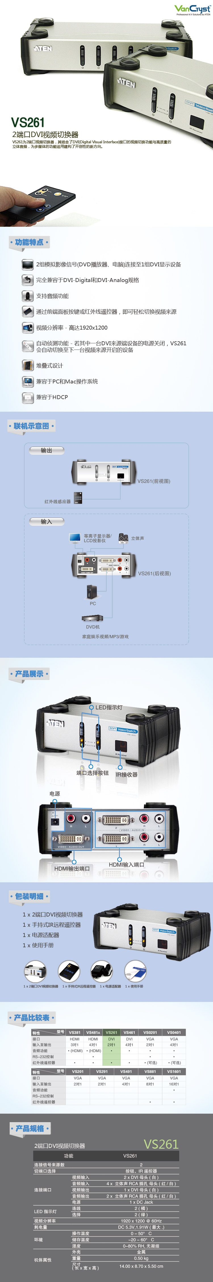 VS261為2端口視頻切換器,其結(jié)合了DVI(Digital Visual Interface)接口的視頻切換功能與高質(zhì)量的立體音頻,為多媒體的功能運(yùn)用建構(gòu)了開創(chuàng)性的新方向。