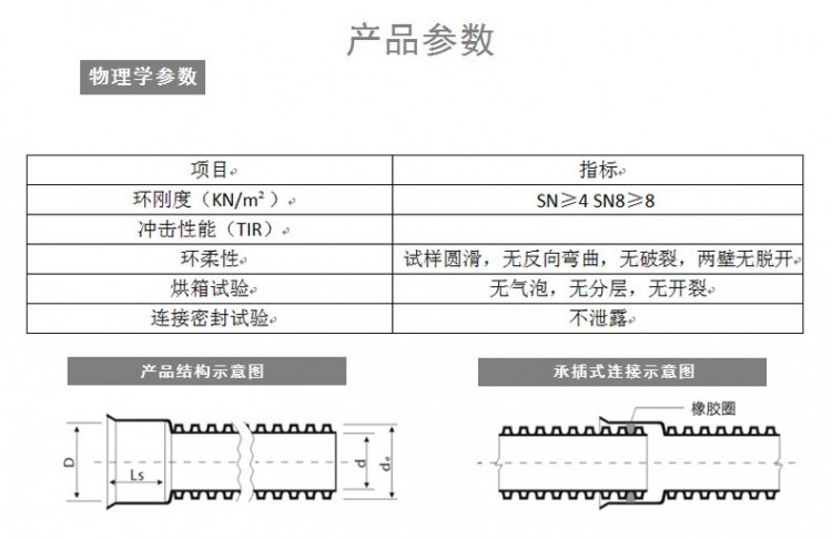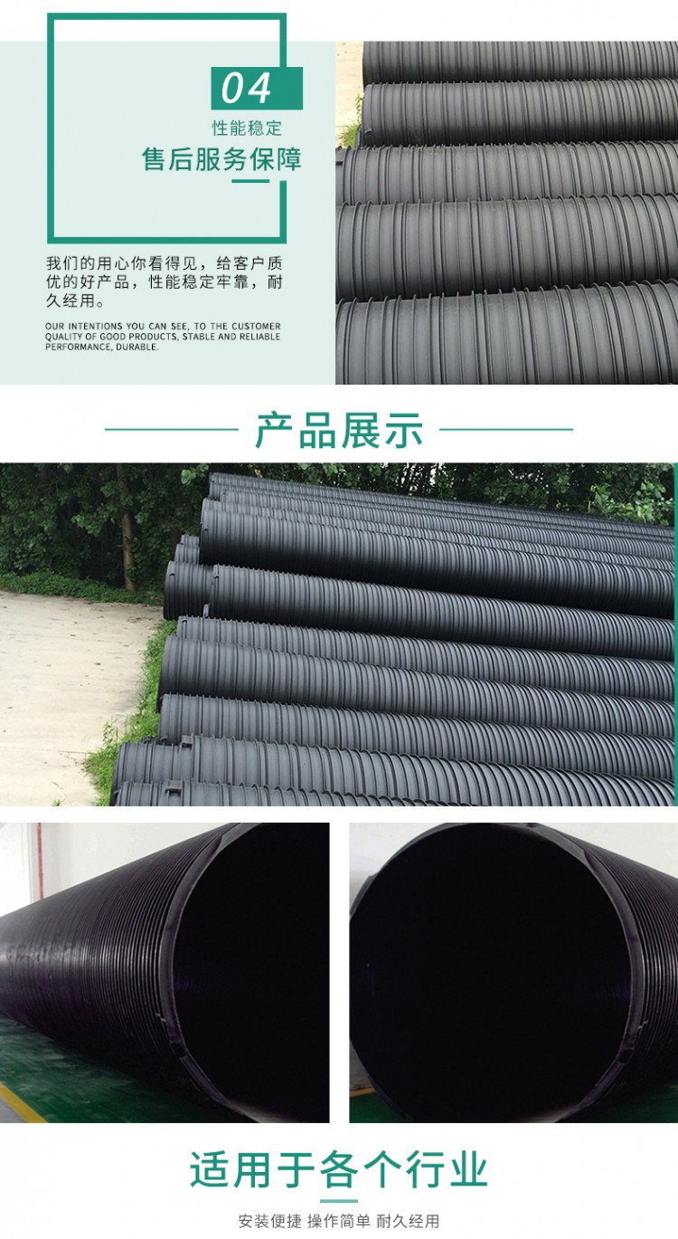 性能特點(diǎn): 1,安全可靠的環(huán)剛度與純塑管相比,增強(qiáng)的鋼帶極易使管材特別是大口徑管材具有足夠安全可靠的環(huán)鋼度。2,內(nèi)壁光滑,流動(dòng)阻力比水泥管低20~30%聚乙烯(PE)管道內(nèi)壁光滑,摩擦系數(shù)小,且沉淀物在管道中不易產(chǎn)生聚集,長期使用后摩阻幾乎不變3柔性或無泄漏(電熔焊、對焊)連接,密封性能及環(huán)保性能好兩種密封連接方式均可以簡單工具手工操作,無需機(jī)械,十分簡便快捷,達(dá)到可靠無泄露4耐腐蝕,使用壽命超過50年高密度聚乙烯(PE)管道使用壽命可長達(dá)五十年5質(zhì)量輕、接頭少,無需大型設(shè)備,安裝鋪設(shè)方便重量輕,安裝時(shí)不需要大型吊運(yùn)設(shè)備。軸向柔性好,敷設(shè)時(shí)對溝槽底部平整度,堅(jiān)實(shí)度要求較低,能承受安裝不當(dāng)所造成的非正常應(yīng)力的能力強(qiáng)6現(xiàn)場生產(chǎn),大大節(jié)省運(yùn)輸費(fèi)用帶材可卷盤(普通電纜盤)運(yùn)輸,管材纏繞裝置簡單緊湊,便于生產(chǎn)商將裝置運(yùn)至工地附近,就近纏繞生產(chǎn)供應(yīng)管材大幅度降低了用戶的運(yùn)輸成本。7抗非正常突發(fā)載荷能力強(qiáng)管材可通過彈性變形來化解由此產(chǎn)生的應(yīng)力,避免管材連接處因承受過大的應(yīng)力及變形而泄露或破壞8綜合造價(jià)具有競爭力集鋼塑兩種材料的優(yōu)點(diǎn)于一身,該管材具有卓越的綜合性能。