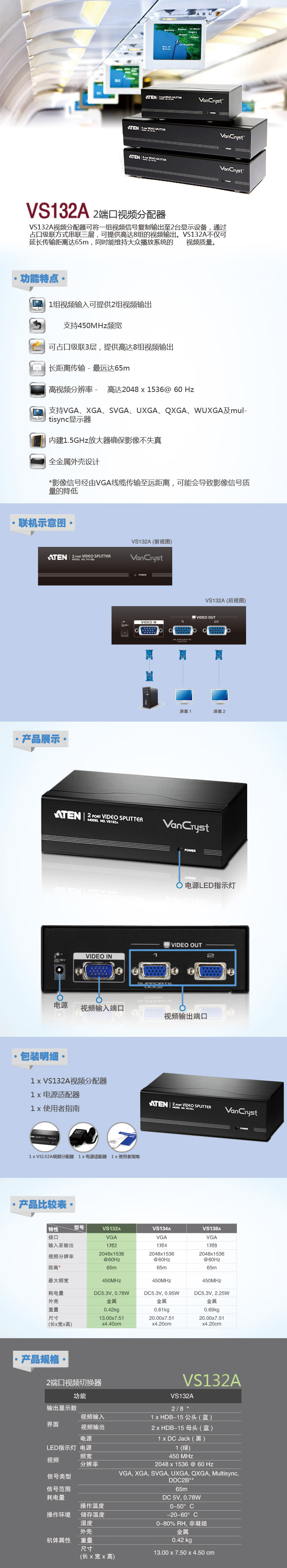 ATEN 宏正 VS132A 2端口VGA視頻分配器 1進(jìn)2出分屏器