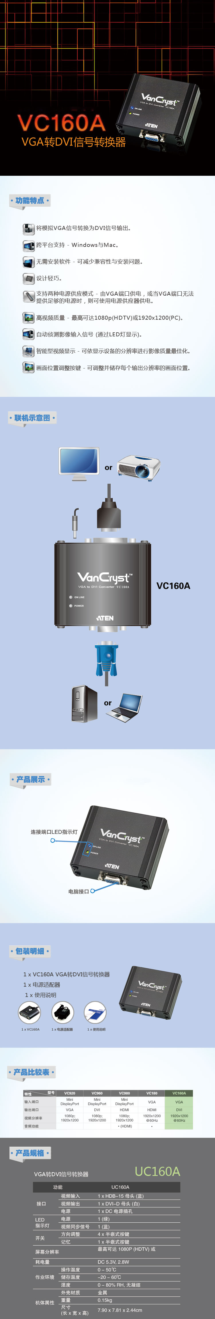 VC160A為一款VGA轉(zhuǎn)DVI信號轉(zhuǎn)換器,可讓使用者在DVI屏幕上觀看VGA影像畫面。該款產(chǎn)品采用兩種電源供應(yīng)模式-從VGA端口或使用電源供應(yīng)器
