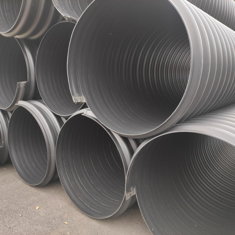 埋地排水用鋼帶增強聚乙烯螺旋波紋管是一種HDPE與鋼熔融復合的結構構壁管,管壁結構由三個層次構成:內層是一個連續(xù)實壁內層管,內層管外纏繞復合有用鋼板折成倒“U”型的環(huán)形波狀鋼板增強體,在涂復波狀鋼板增強體外復合有與鋼板增強體波形相同的HDPE外層。