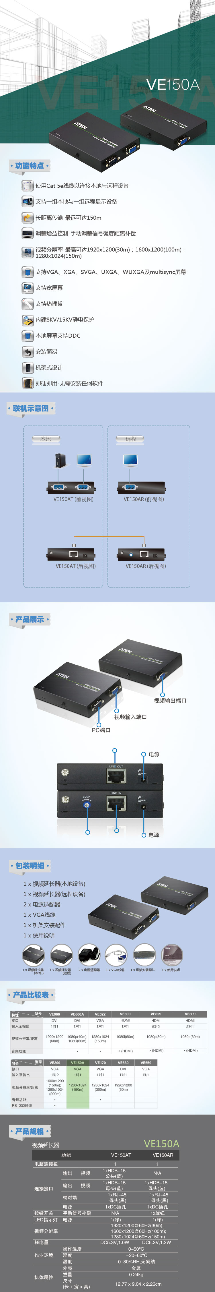 VE150A視頻延長器為一臺本地傳送設備及一臺遠程接收設備,通過Cat 5e線纜能讓兩臺設備間距離延長至150m,適合于工廠、施工工地或任何其顯示設備可能需暴露于具風險的危險區(qū)域,而主機系統(tǒng)則需安置于安全地點的安裝架構。