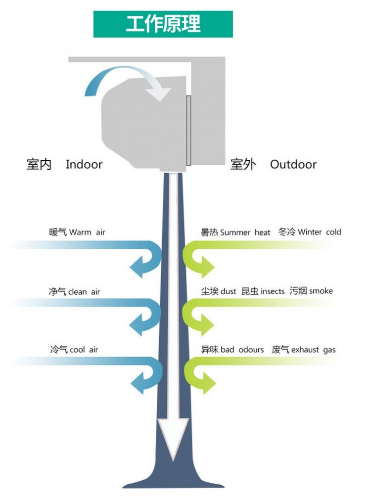 持續(xù)形成的空氣門,能有效的防止冷(暖)氣外泄,餐館、商店和娛樂場所這樣的顧客經(jīng)常出入的地方不需要不斷開關(guān)門。有效隔離室內(nèi)外冷、暖的空氣對流,保持溫度,節(jié)約用電。