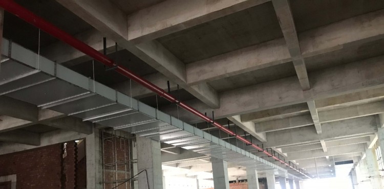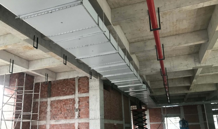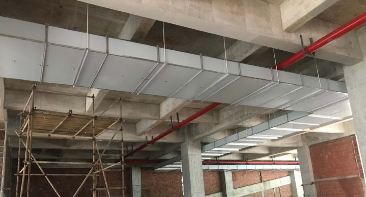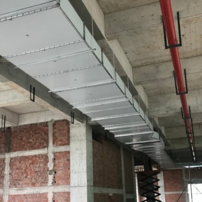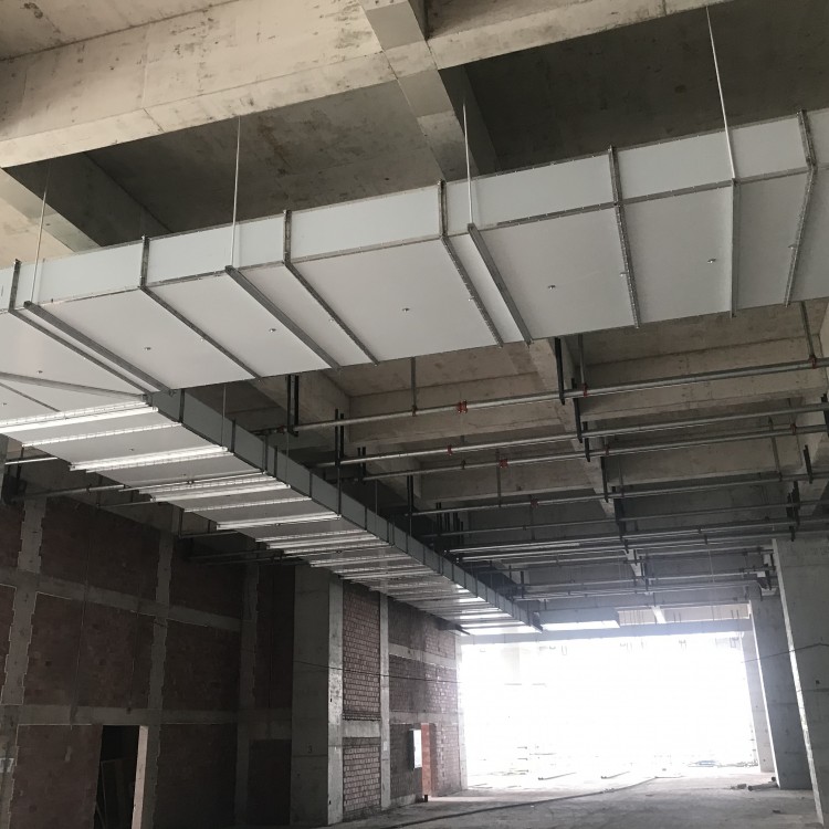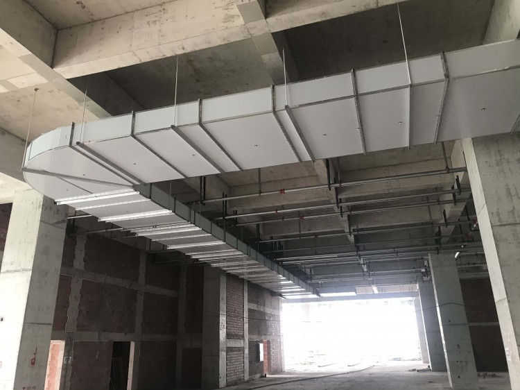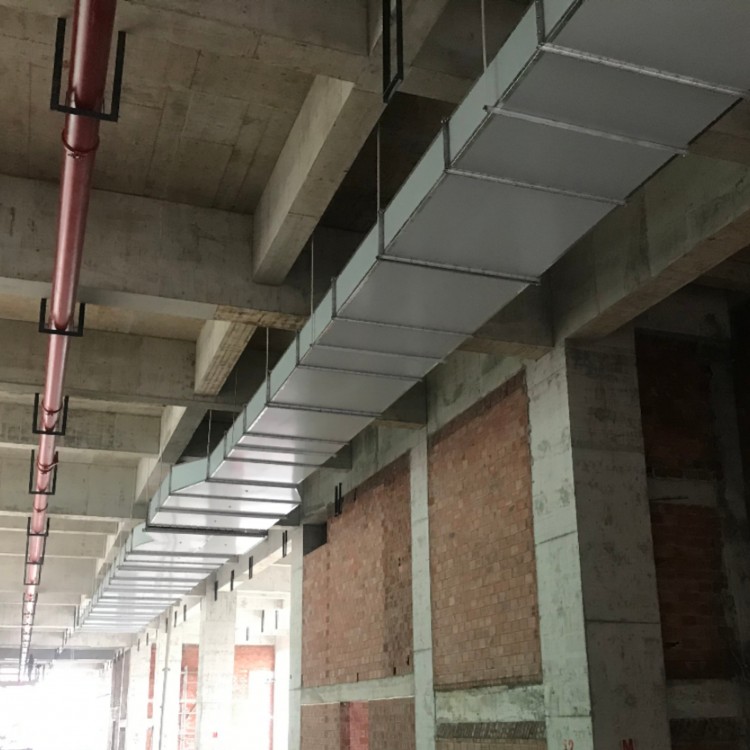 一體式通風(fēng)管道由14mm厚單面彩鋼硫氧鎂防火板組成管體,每段管道通過鋼制法蘭連接