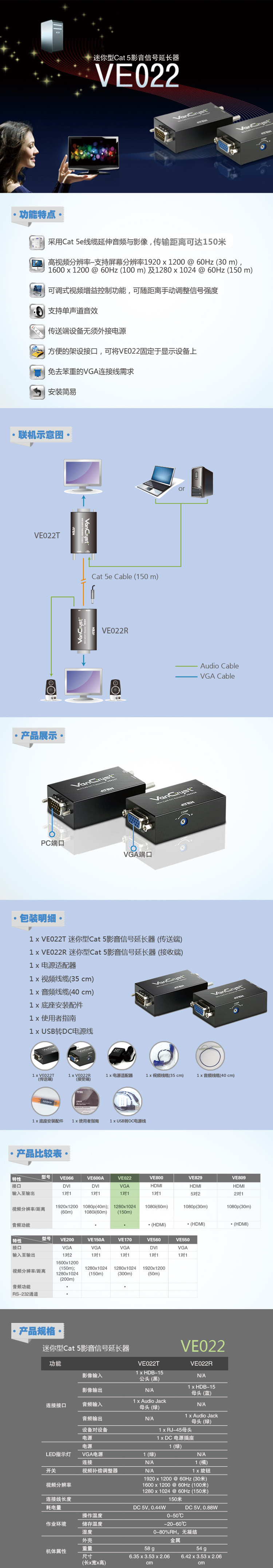 VE022迷你型Cat 5影音信號延長器能提供使用者簡便的連接方式以取代沉重且昂貴的VGA線纜,僅需使用一條Cat 5e線纜,即可將影音信號來源設(shè)備與顯示屏幕之間的距離延伸遠(yuǎn)達(dá)150m。此外,VE022支持熱插拔功能,使用者毋需將設(shè)備關(guān)機(jī),即可輕松的將VE022傳送端設(shè)備(Transmitter)/接收端設(shè)備(Receiver) 從連接的信號來源設(shè)備/顯示屏幕進(jìn)行安裝或移除。VE022迷你型Cat 5影音信號延長器,兼具外型精巧、操作簡便與高經(jīng)濟(jì)效益的特性,是建置影音設(shè)備環(huán)境的理想方案。