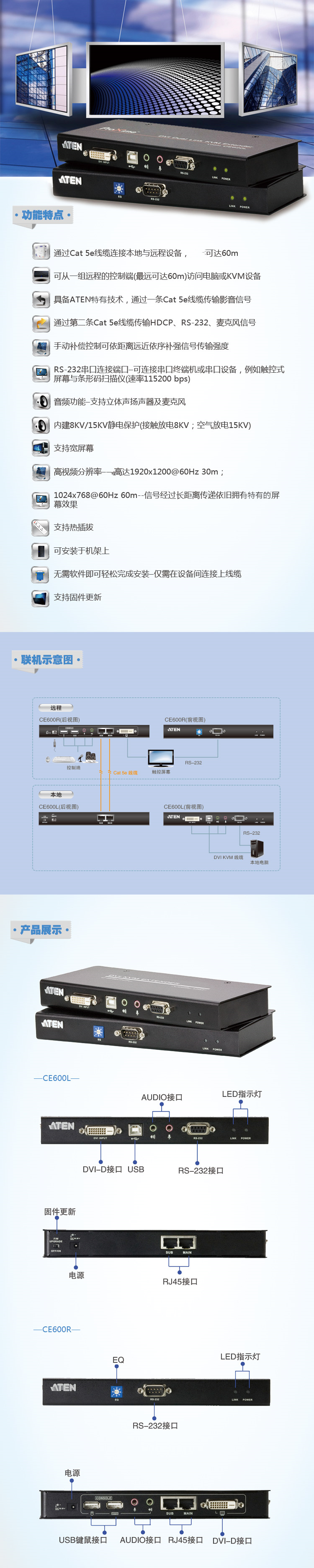 可從一組遠(yuǎn)程的控制端(遠(yuǎn)可達(dá)60m)訪問電腦或KVM設(shè)備