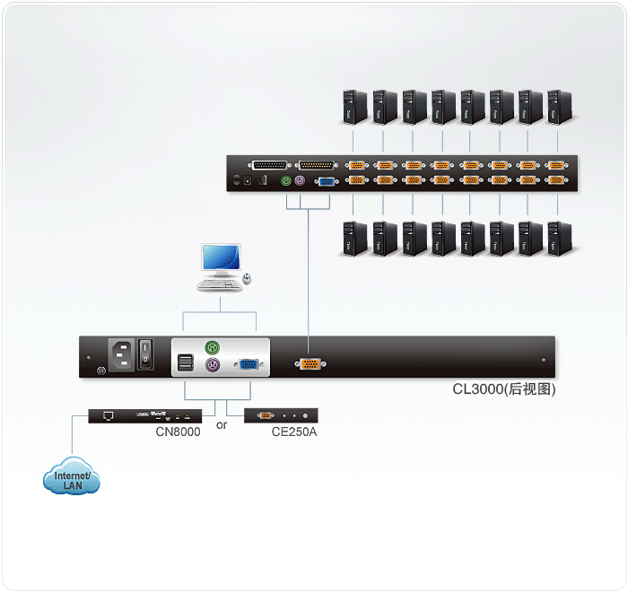 CL3000輕量型PS/2-USB雙接口LCD控制端,為一款整合式KVM(鍵盤、顯示器、鼠標(biāo))控制端,可作為KVM多電腦切換器的前端控制端使用。