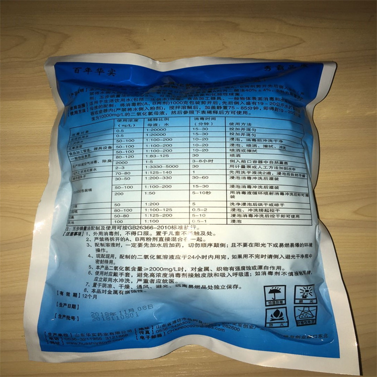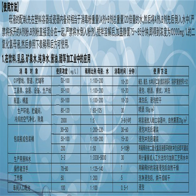 消毒劑按比例投入水中活化溶解后,釋放出二氧化氯溶解于水中,此時(shí)成為二氧化氯消毒液。穩(wěn)定性二氧化氯含量10%±1%。