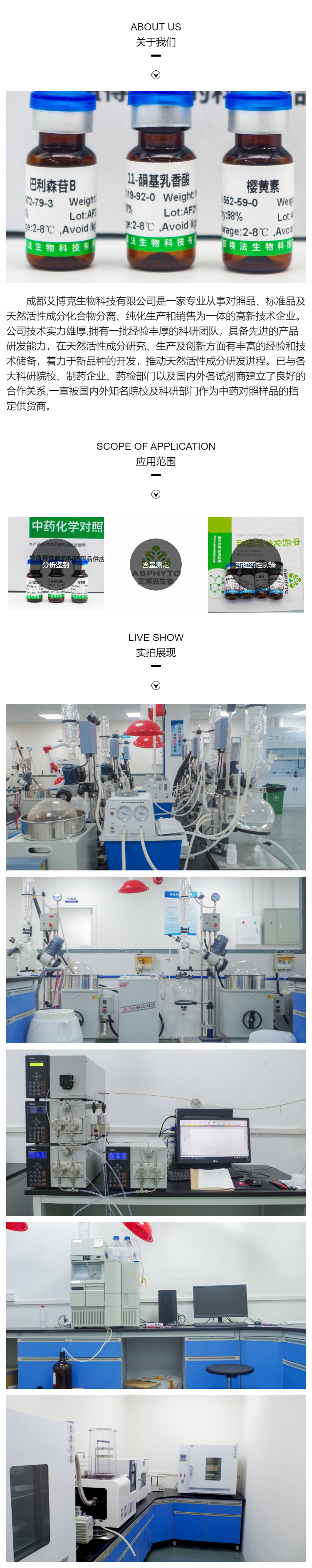 我公司專注于中藥對(duì)照品/標(biāo)準(zhǔn)樣品/對(duì)照藥材研發(fā)及銷售,現(xiàn)貨產(chǎn)品2000余種,產(chǎn)品保證質(zhì)量,隨貨附帶液相、核磁圖譜,質(zhì)量問題無(wú)條件退換。歡迎聯(lián)系 QQ:3005329912 電話(微信):18180805285 官網(wǎng):http://www.alfabiotech.cn/