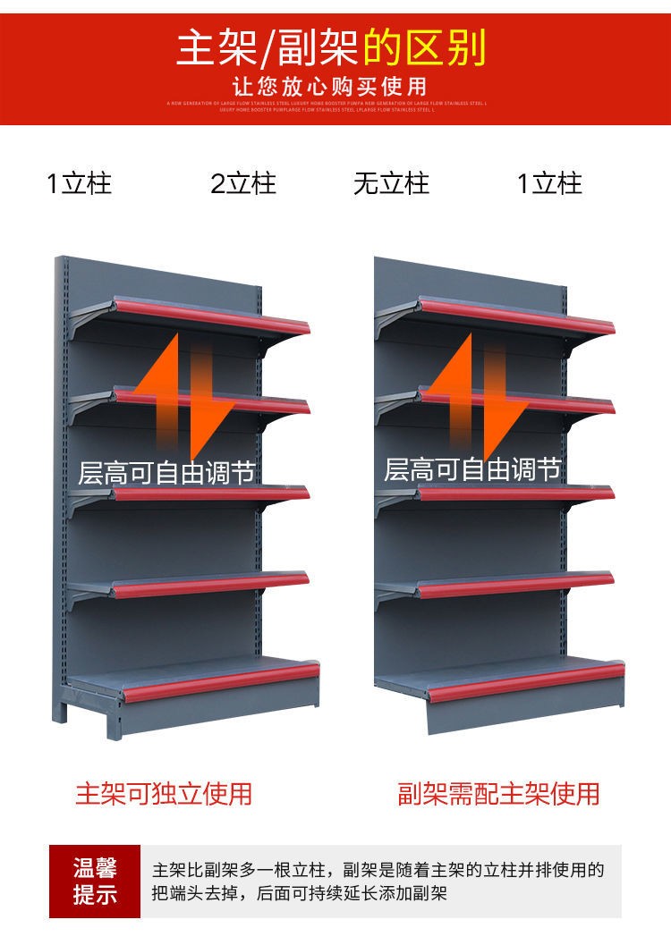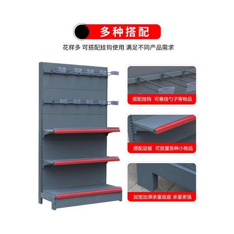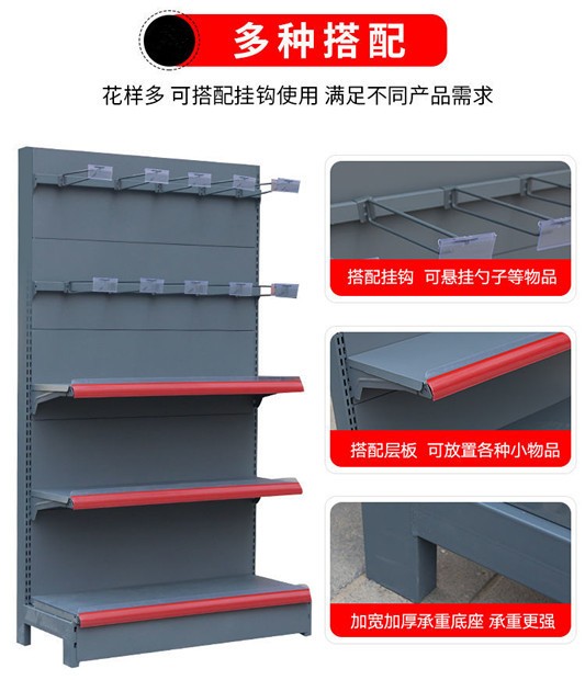1.美觀大方、結(jié)構(gòu)牢固、規(guī)格多樣;設(shè)計(jì)造型具有時(shí)代氣派,超市貨架是單雙面貨架可以相互結(jié)合,單面貨架可與轉(zhuǎn)角配套結(jié)合,雙面可與半圓配套結(jié)合;層間距可任意調(diào)節(jié),顯得高貴大方;