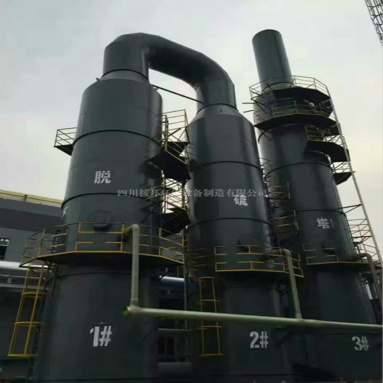 噴淋脫硫單塔采用碳鋼內(nèi)襯花崗巖,制作成分體模塊結(jié)構(gòu),合(或制作成整體鋼制塔內(nèi)襯花崗巖) ?,F(xiàn)場吊裝組,單塔噴淋用于初始粉塵濃度較低的煙氣,內(nèi)置旋流板、折流板除霧器、反沖洗噴淋裝置,洗滌噴淋裝置三層, S0 2去除效率達(dá)95% 以上。
