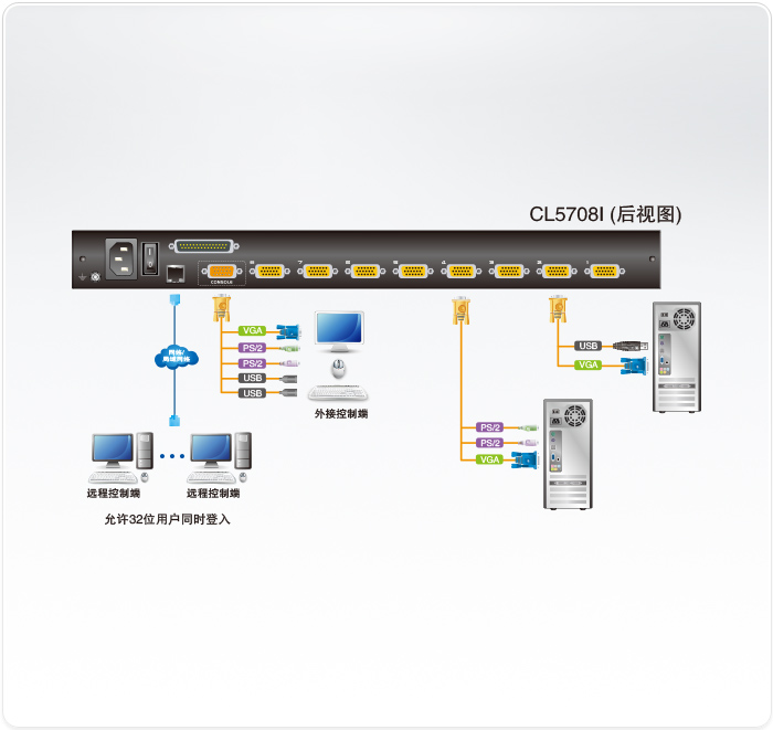 雙接口- 支持配備PS/2或USB鍵盤及鼠標(biāo)的服務(wù)器與控制端