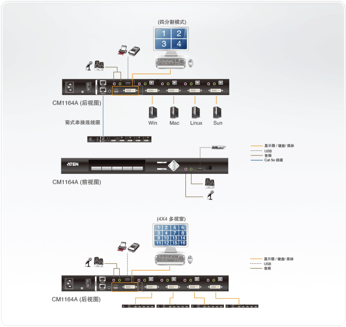 菊式串接功能(DCC) - 使用者CM1164A控制端所接的鍵盤、鼠標,即可管理操作多達四級CM1164A