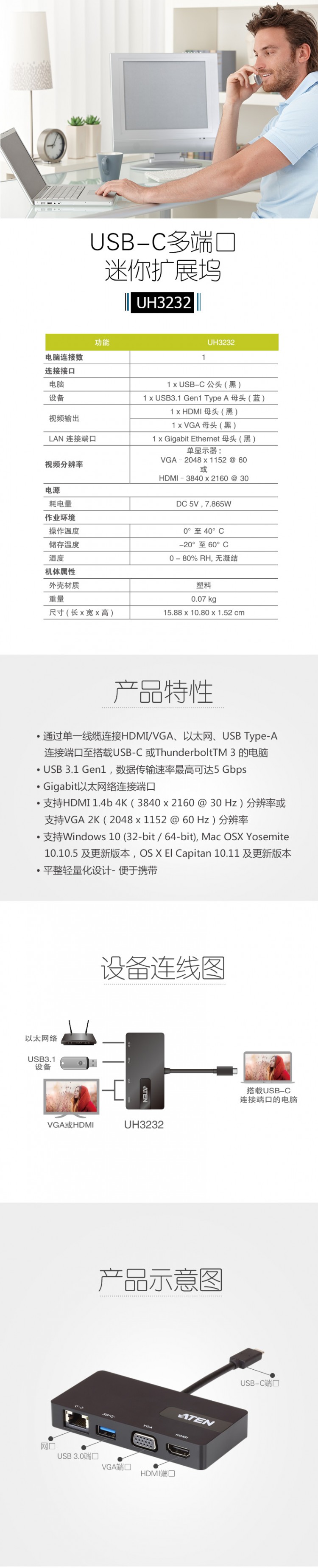 通過單一線纜連接HDMI/VGA、以太網(wǎng)、USB Type-A 連接端口至搭載USB-C 或ThunderboltTM 3 的電腦