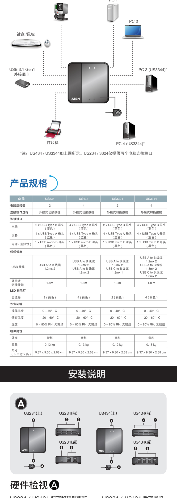 ATEN 宏正 US434 4x4口USB 3.1 Gen1端口外圍分享切換器外接按鍵控制傳輸高達(dá)5Gbps無需單獨(dú)供電工業(yè)級 US434-AT