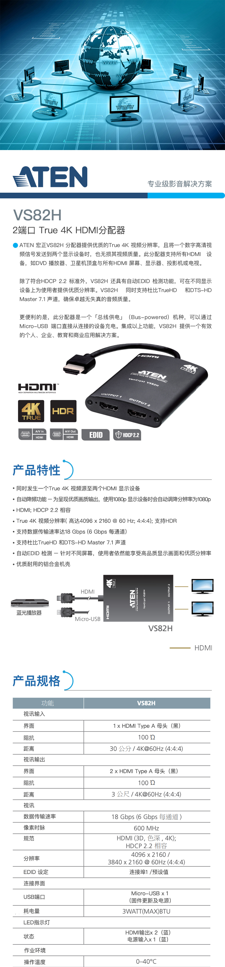 ATEN VS82H 分配器提供優(yōu)質(zhì)的True 4K 視頻分辨率,且將一數(shù)字高清視頻信號發(fā)送到兩個顯示設(shè)備時,也無損其視頻質(zhì)量。此分配器支持所有HDMI 設(shè)備,如DVD 播放器、衛(wèi)星機(jī)頂盒與所有HDMI 屏幕、顯示器、投影機(jī)或電視。