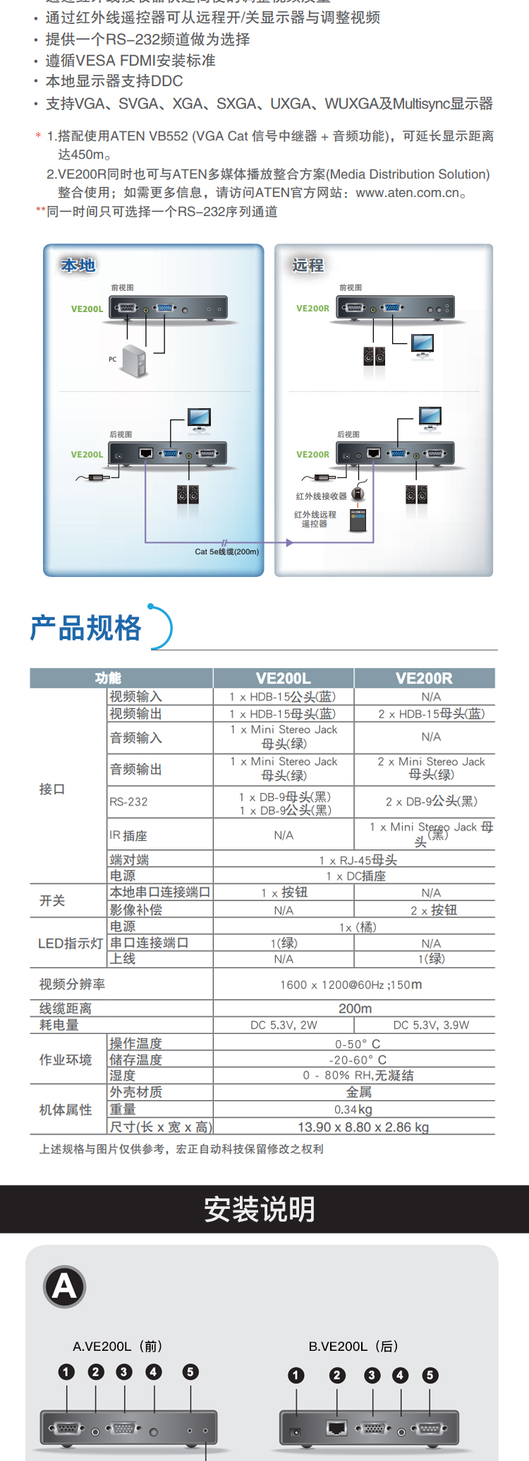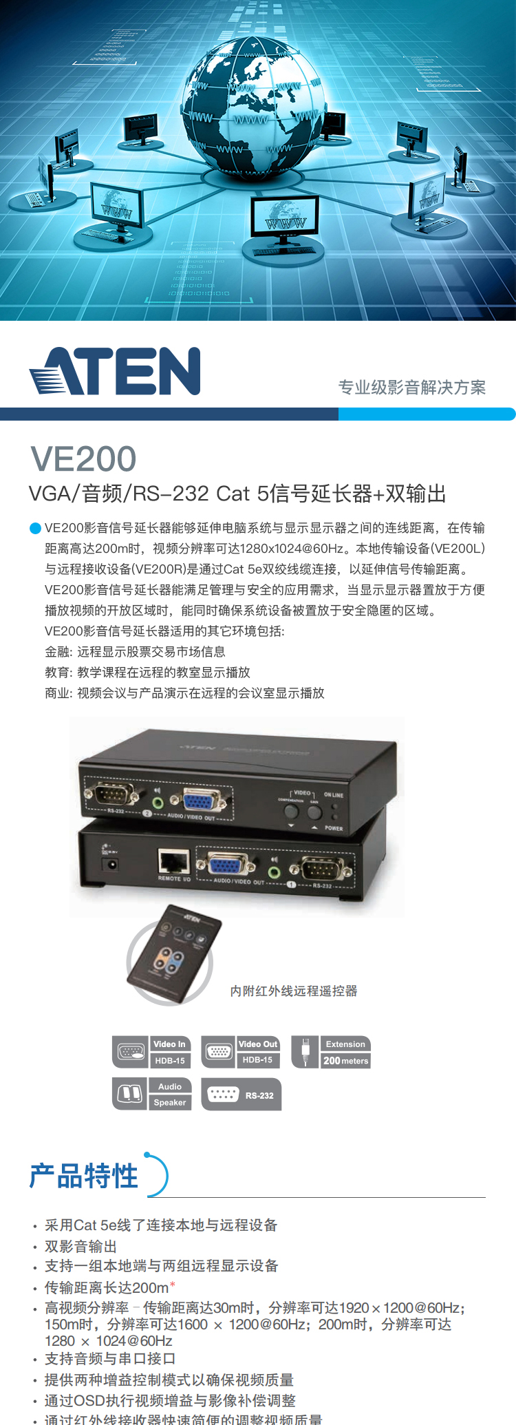高視頻分辨率-1920x1200@60Hz (30m); 1600x1200@60Hz (150m); 1280x1024@60Hz (200m)