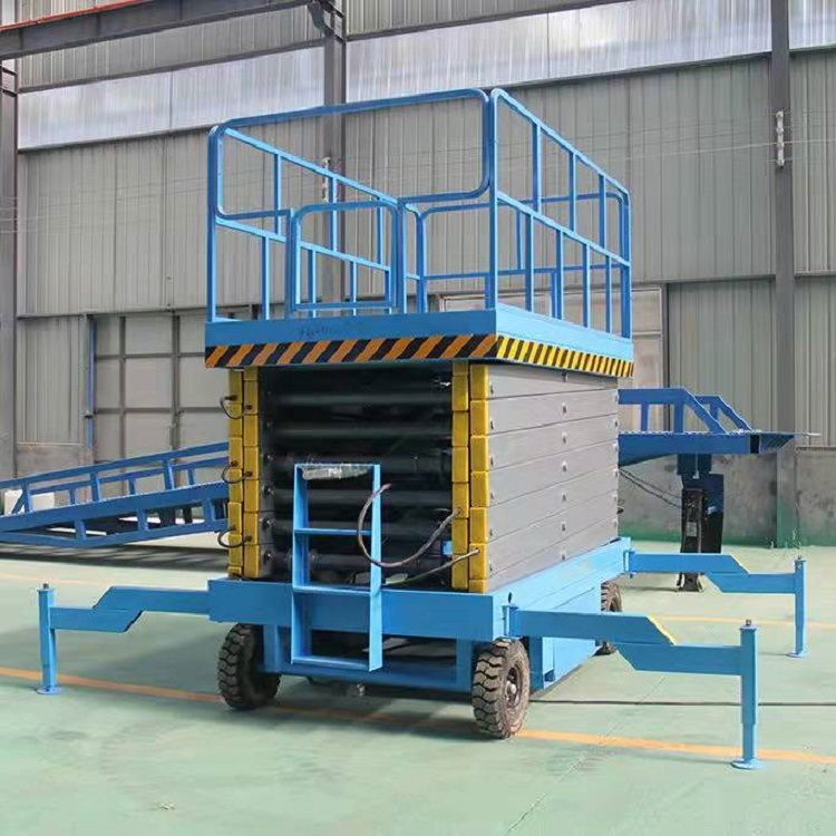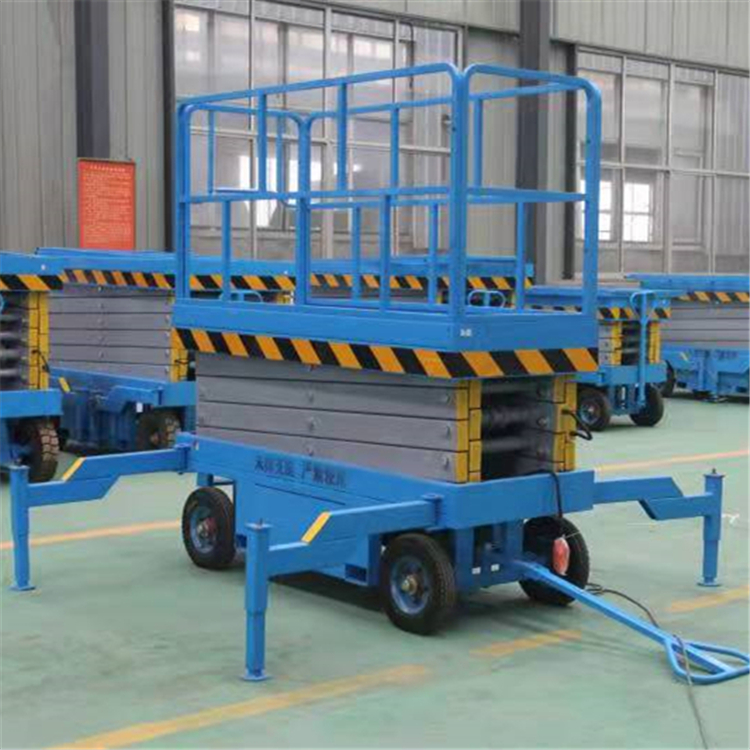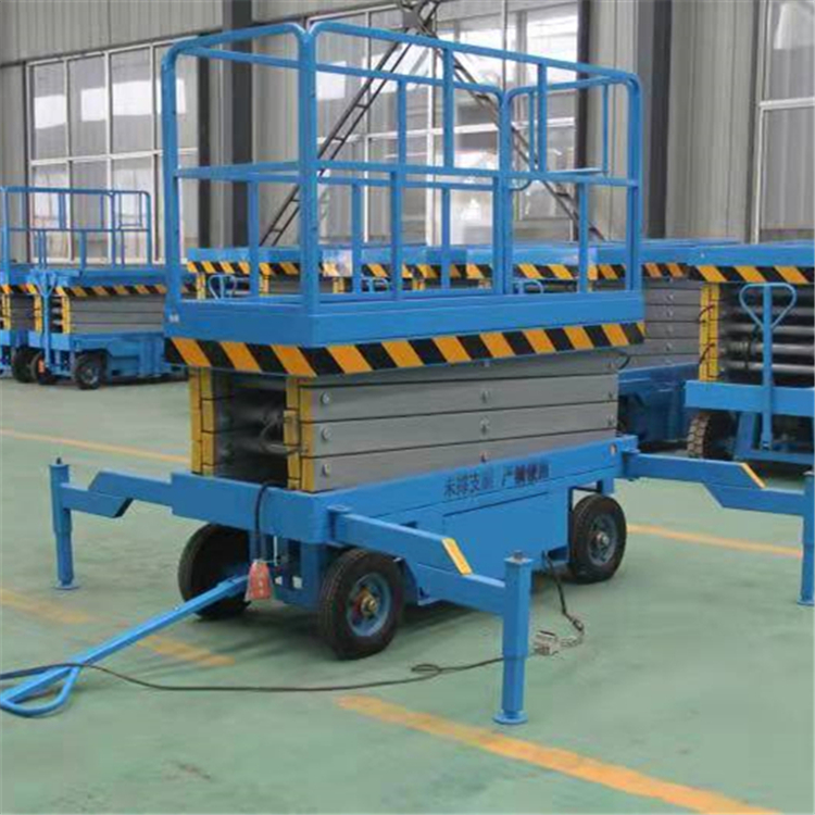 移動(dòng)式升降機(jī)為人工移動(dòng)式,裝有四個(gè)移動(dòng)輪,可兩至三人進(jìn)行牽引推拉移動(dòng),也可用汽車拖掛移動(dòng)。