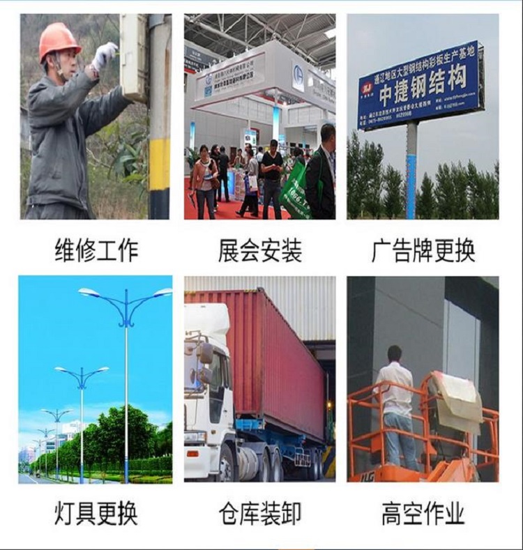 適用于工地、廠房、倉庫、車站、賓館、機(jī)場(chǎng)、碼頭、加油站、體育場(chǎng)、高架管道等高空設(shè)備安裝維修、清潔等,還用于起吊設(shè)備維護(hù),野外電力設(shè)施維護(hù),鋼架結(jié)構(gòu)廠房維護(hù)等。