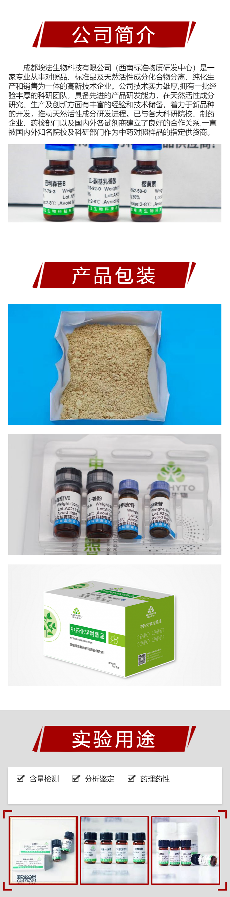我公司專注于中藥對照品/標準樣品/對照藥材研發(fā)及銷售,現(xiàn)貨產(chǎn)品2000余種,產(chǎn)品保證質(zhì)量,隨貨附帶液相、核磁圖譜,質(zhì)量問題無條件退換。歡迎聯(lián)系 QQ:3005329912 電話(微信):18180805285 官網(wǎng):http://www.alfabiotech.cn/