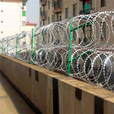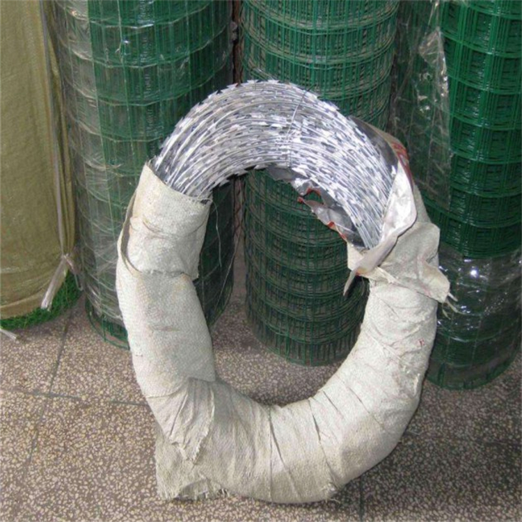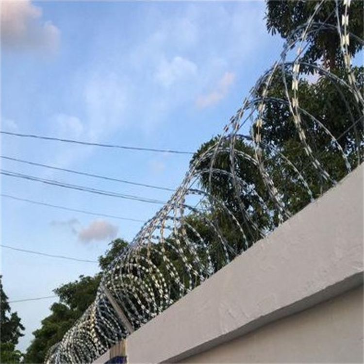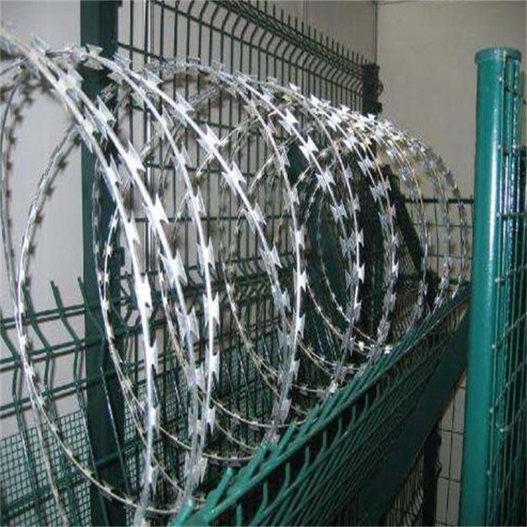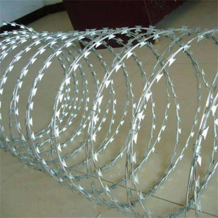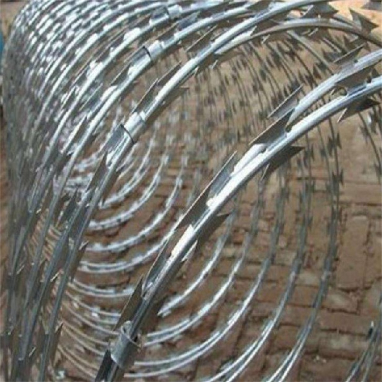 防盜刀片刺網(wǎng)是一種新型防護(hù)網(wǎng)。該產(chǎn)品具有嚇阻效果好·美觀·施工便利·經(jīng)濟(jì)實(shí)用等優(yōu)異特點(diǎn)。刀片刺繩防護(hù)網(wǎng)主要用于園林公寓·機(jī)關(guān)單位·監(jiān)獄·哨所·邊防等的圈禁防護(hù)。刀片刺繩防護(hù)網(wǎng)由銳利尖角鍍鋅鋼板或不銹鋼薄板做刀片,高張力鋼絲做芯線組合而成的阻絕器材。由于刀片刺繩防護(hù)網(wǎng)造形獨(dú)特不易觸摸,因而能達(dá)到極好的防護(hù)隔離效果。直線形刀片刺網(wǎng)由刀片型直線刺網(wǎng)交叉焊接成型,可用于防盜窗、高速護(hù)欄、隔離柵。施工迅速、效果顯著。產(chǎn)品特點(diǎn):防腐、防老化、抗曬、耐久等。