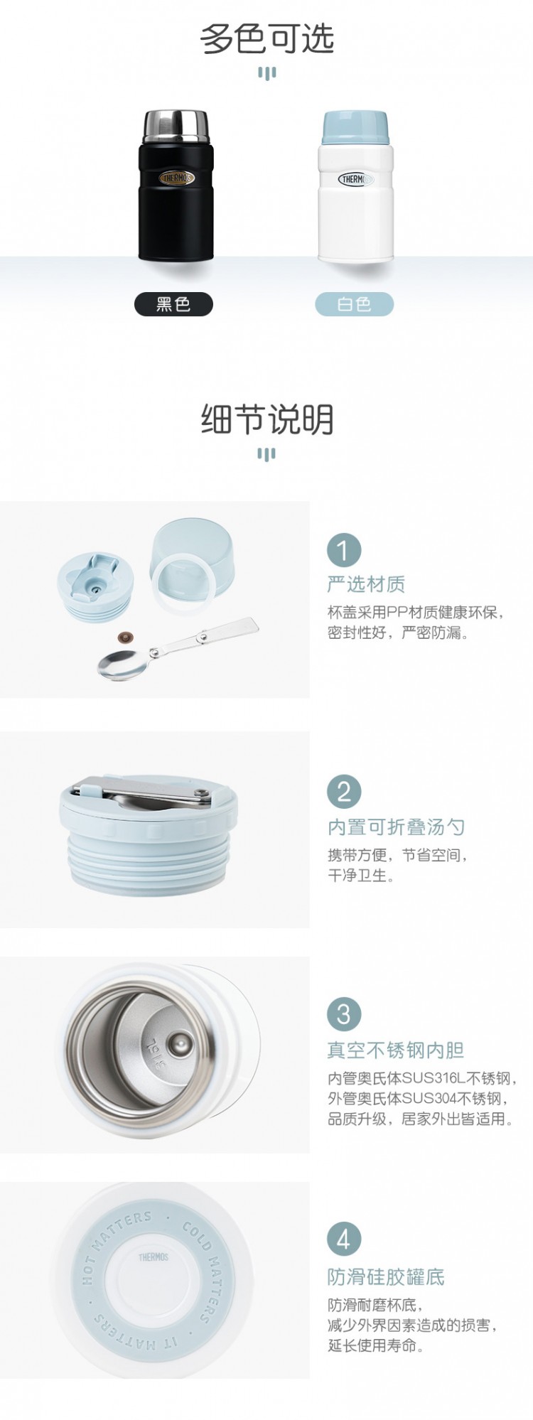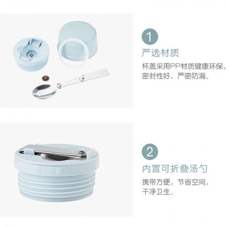 4.食品級PP材質(zhì)瓶塞,密封性強,嚴密防漏。內(nèi)置不銹鋼折疊湯勺,方便攜帶。