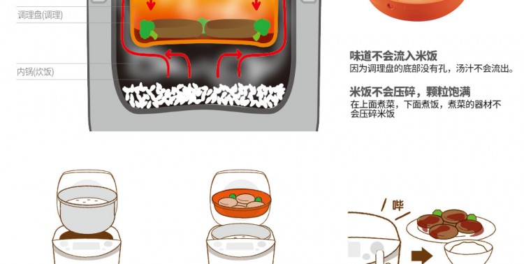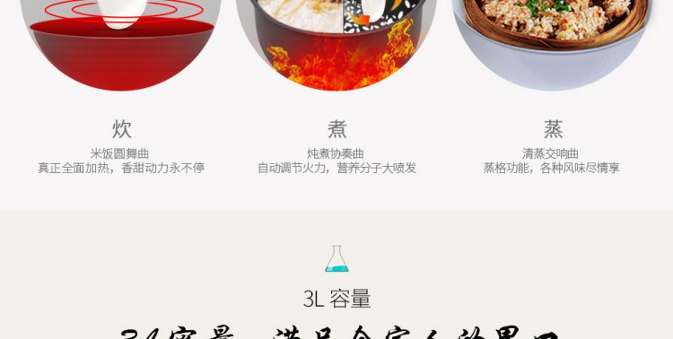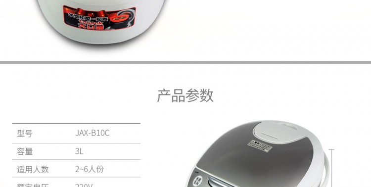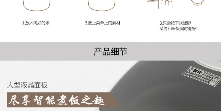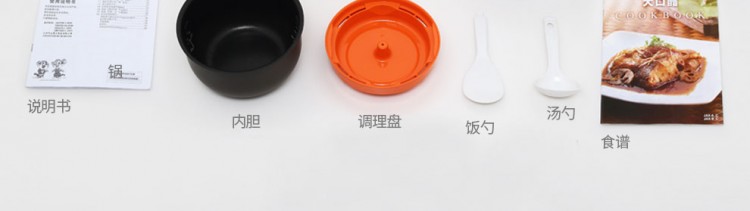 電飯煲、內(nèi)膽、調(diào)理盤、飯勺、湯勺、說明書、質(zhì)???、食譜。
