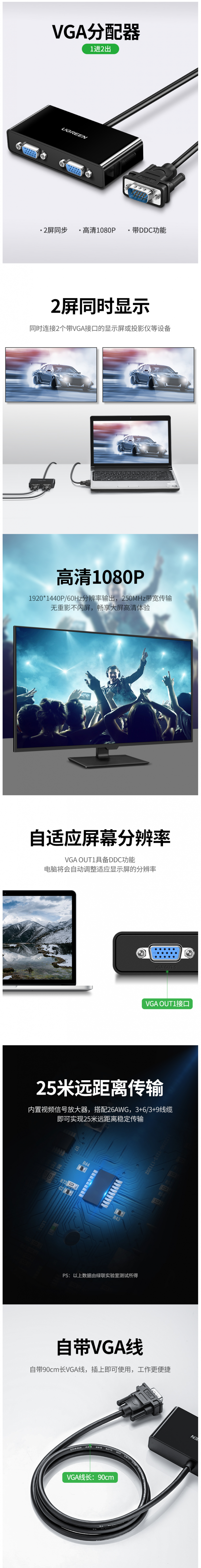 綠聯(lián) 四川總代理 VGA分配器一分二 筆記本電腦顯示器分屏器 高清視頻轉(zhuǎn)換器一進(jìn)二出同屏器 1分2分頻器 40254