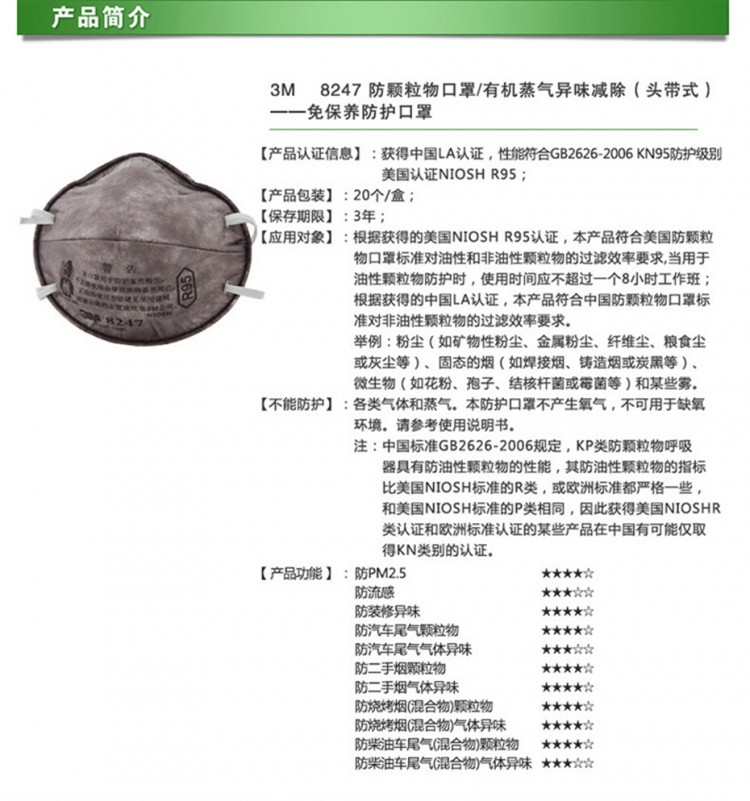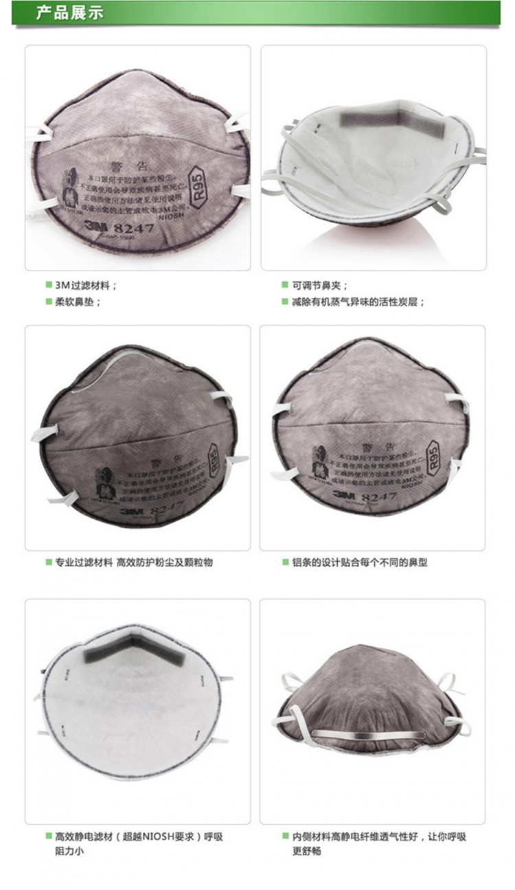 3M 8247CN防顆粒物口罩活性炭口罩頭戴式防有機(jī)蒸汽防油煙防異味20個(gè)/盒