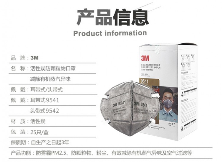 3M 9541 KN95活性炭口罩(耳帶式) 一盒 防霧霾PM2.5防異味裝修防粉塵25個(gè)/盒