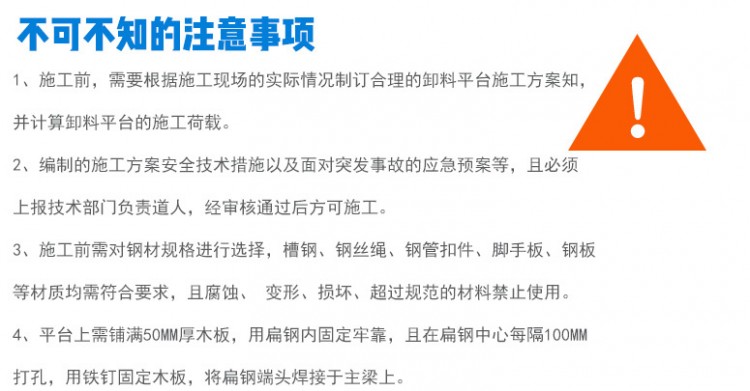 3、在計(jì)算卸料平臺(tái)的施工荷載時(shí)應(yīng)按3kN/㎡進(jìn)行計(jì)算,且實(shí)際使用荷載應(yīng)控制在2kN/㎡內(nèi),同時(shí)卸料平臺(tái)寬度不應(yīng)大于3m,長度不應(yīng)大于3.5m。