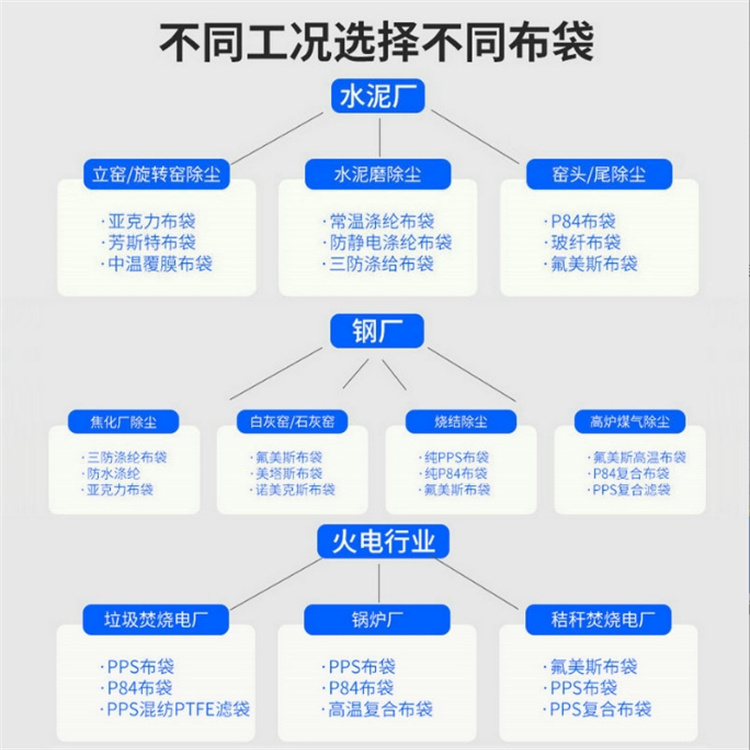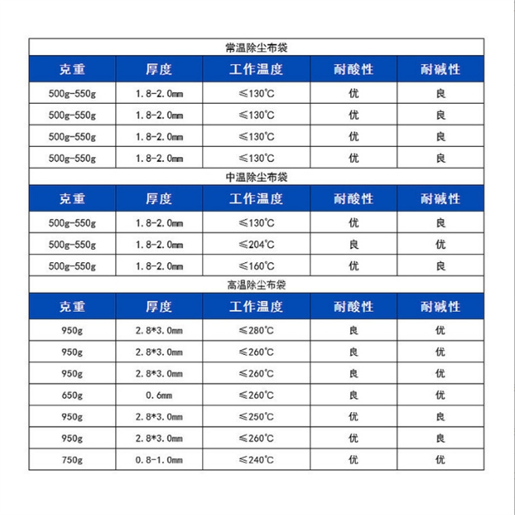 除塵布袋的面料和設計應盡量追求高效過濾、易于粉塵剝離及經(jīng)久耐用效果。除塵布袋的選用至關重要,它直接影響除塵器的除塵效果,選取用除塵布袋從下列幾個方面選取擇:氣體的溫度,潮濕度和化學性,顆粒大小,含塵濃度,過濾風速,清塵方式等因素。