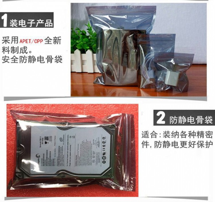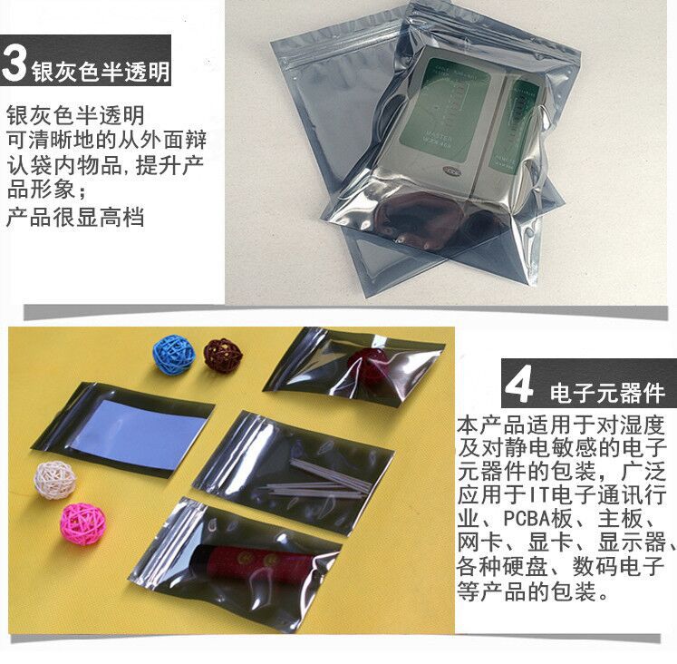 材料結(jié)構(gòu):APET/CPP/CPE ,雙層厚度:150±5um(0.15mm/15絲),外觀顏色為銀灰色半透明內(nèi)置物可視,內(nèi)外層電阻為:10的8-10次方歐姆