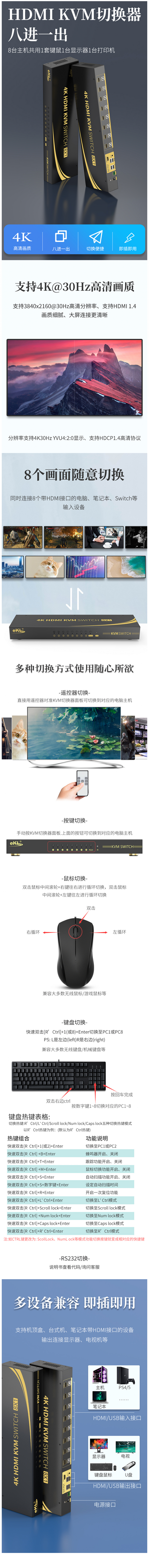 eKL 四川總代理 81HK KVM切換器8口 HDMI切屏器8進(jìn)1出高清視頻自動切換電腦電視顯示器USB鍵鼠打印機(jī)共享器