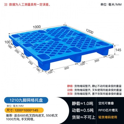 九腳托盤底部有9個(gè)腿組成,表面是網(wǎng)格狀,九腳托盤不易于上貨架或者較重貨物的周轉(zhuǎn)使用,大多情況下都是用來(lái)倉(cāng)庫(kù)貨物墊倉(cāng)板防潮使用和輕貨物的周轉(zhuǎn)。