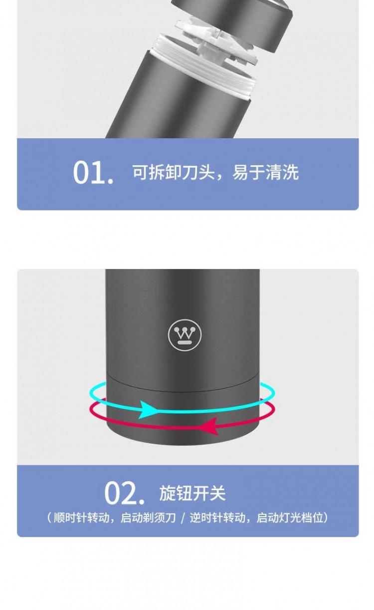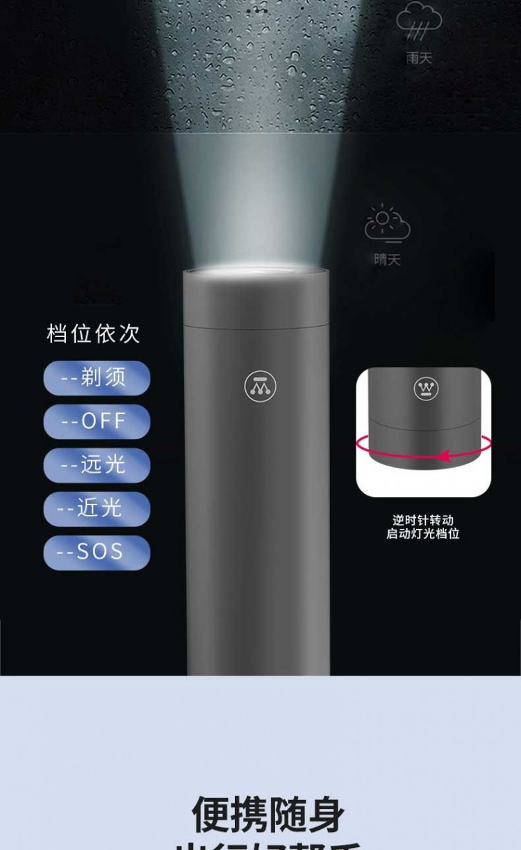 6.檔位依次:剃須--OFF—遠(yuǎn)光—近光--SOS爆閃。