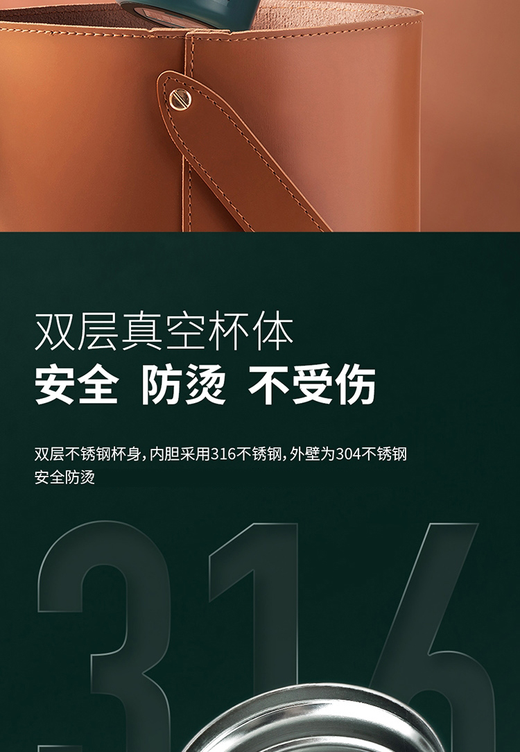 4、雙層不銹鋼杯身,內(nèi)膽采用316不銹鋼,外壁為304不銹鋼安全防燙,健康無異味,長時(shí)間加熱也不會(huì)析出有害物質(zhì)。