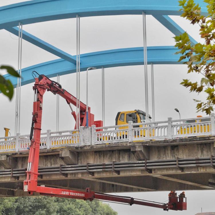 吊籃式橋梁檢測車也稱折疊臂式橋梁檢測車(如圖1、圖2),其結構小巧,受橋梁結構制約少,工作靈活,既可檢測橋下也可升起檢測橋梁上部結構,可有線/無線操作,靈活方便,有時候還可以作為高空作業(yè)車使用,價格相對桁架式橋檢車低。其基本結構充分體現(xiàn)了折疊臂式