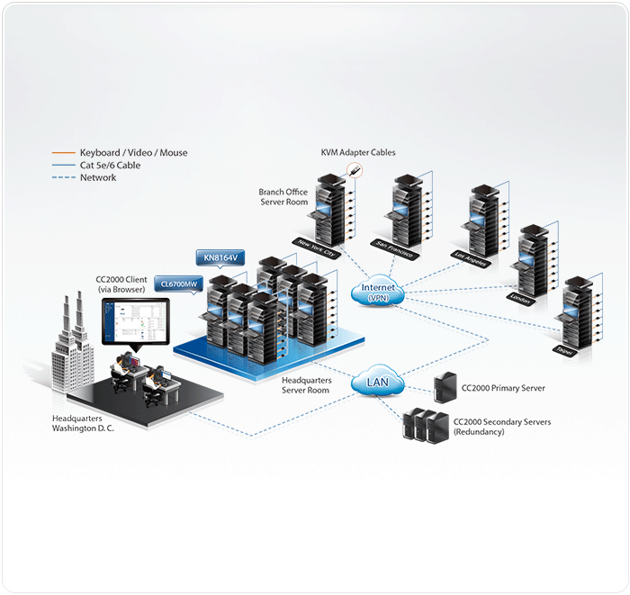 可通過單一登陸 (Single sign-on) 整合管理ATEN 的 KVM over IP 多電腦切換器、串口控制端服務器、PDU 電源分配器、以及第三方設備,例如:嵌入式服務處理器 (Service Processor)、刀片服務器與虛擬服務器等等