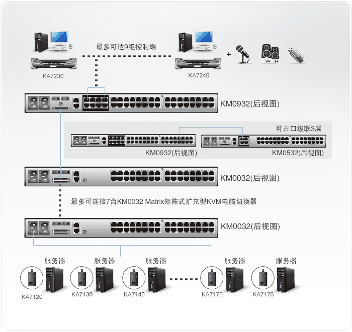 •矩陣式KVM多電腦切換器可占口級(jí)聯(lián)三層