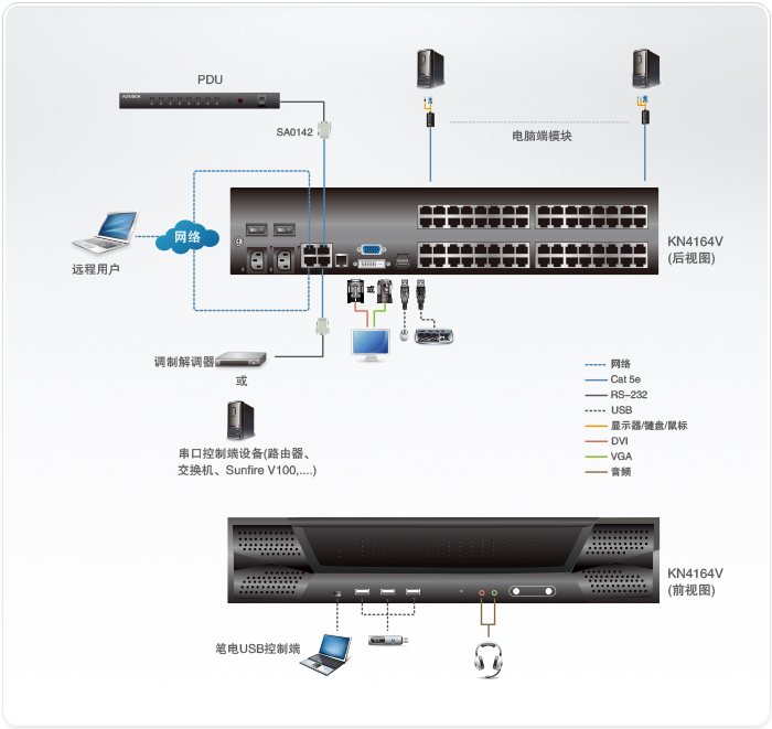 支持PS/2、USB、Sun Legacy(13W3)及串口(RS-232)連接