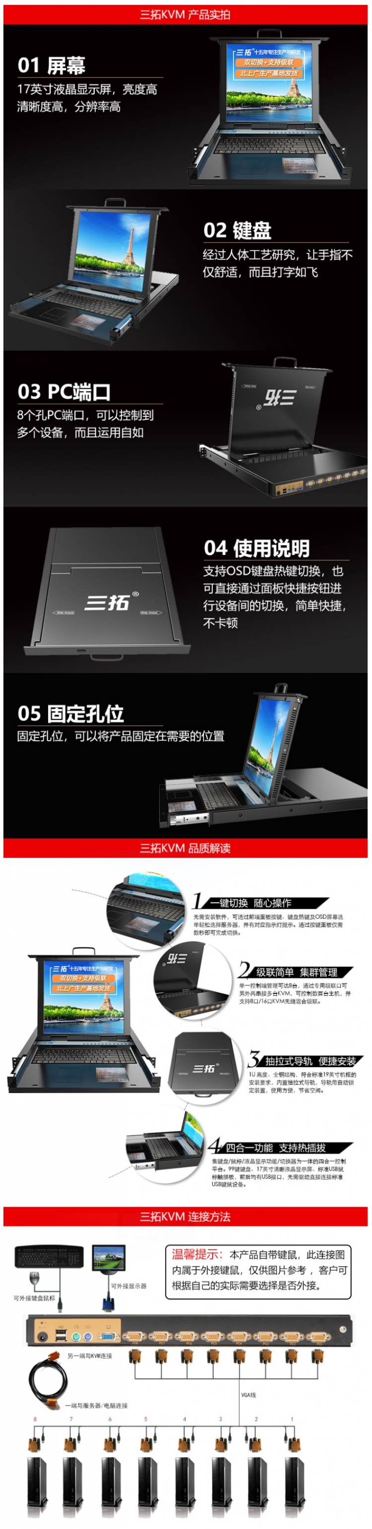 1、4合1-體機,結(jié)合了顯示器、鍵盤、鼠標(biāo)、切換器的功能,是依據(jù)標(biāo)準(zhǔn)19英寸